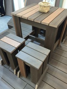 (机と椅子は今回の展示会のために「新デッキ材」で製作いたしました。)