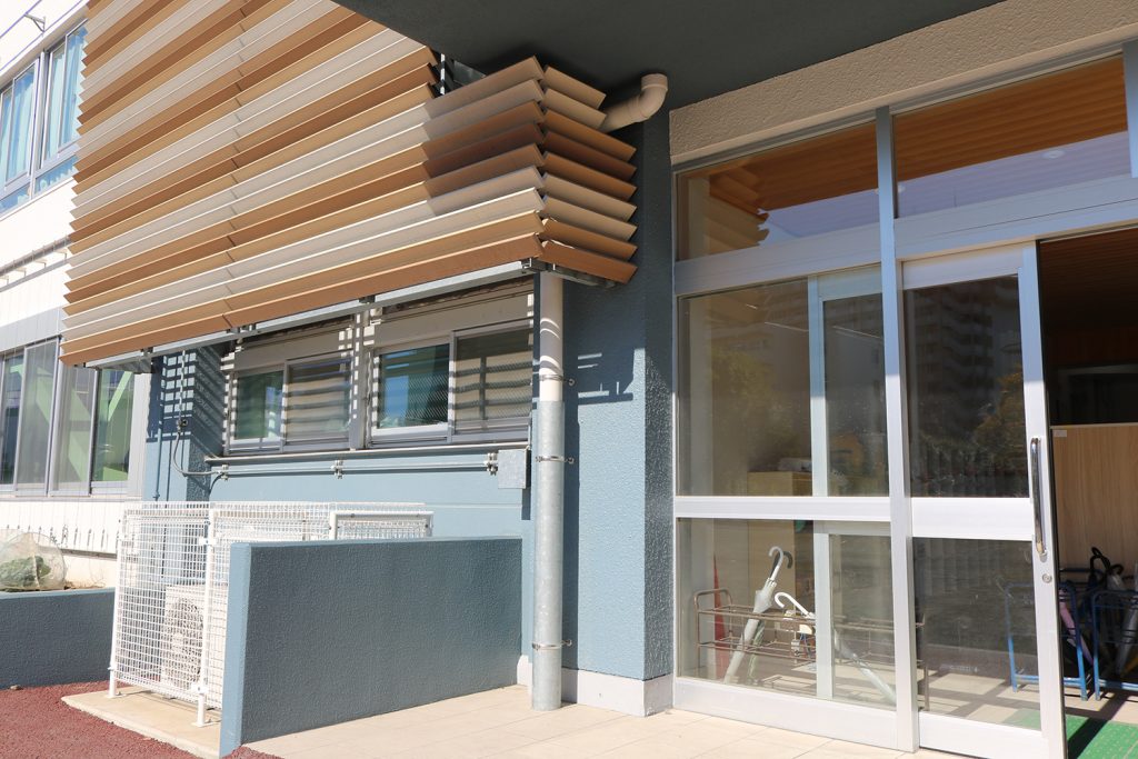 天然木さながらの質感で、白と青がベースの校舎に柔らかく彩りを添えています。